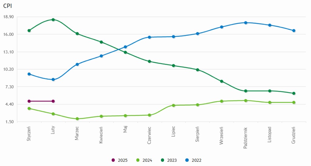 Inflacja, czyli wskaźnik cen towarów i usług konsumpcyjnych, opisuje spadek siły nabywczej pieniądza. Poniżej prezentujemy opublikowany przez Główny Urząd Statystyczny wykres z wartościami inflacji CPI w kilku ostatnich latach.