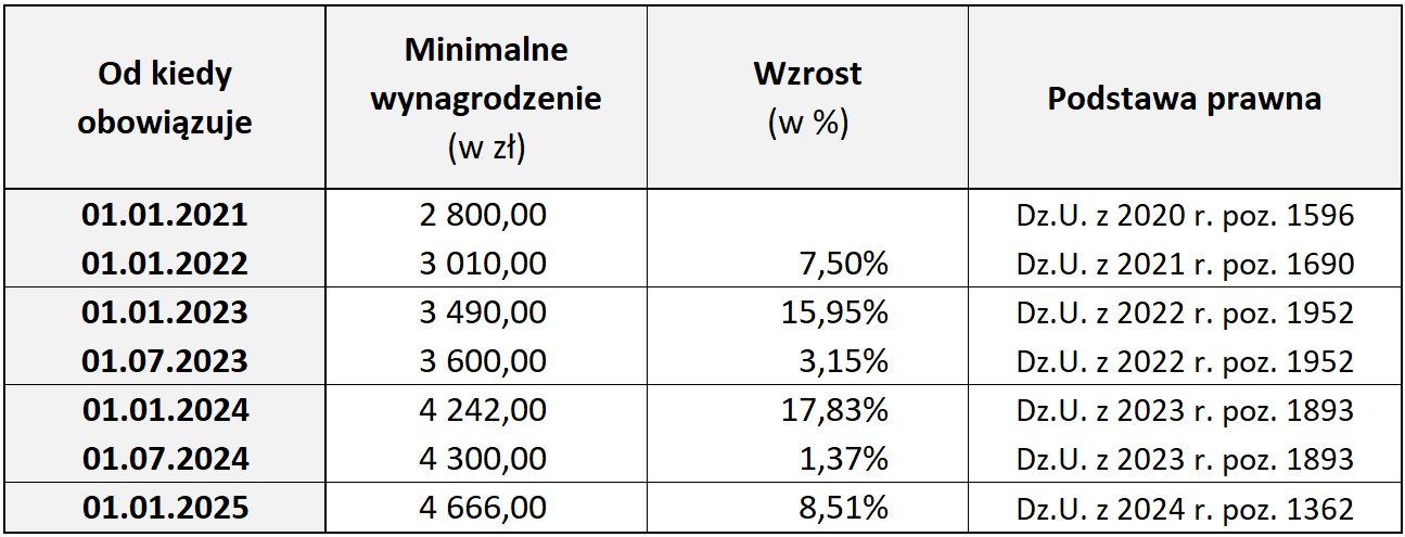 Wartości minimalnego wynagrodzenia obowiązujące w ostatnich latach podajemy w tabeli poniżej.